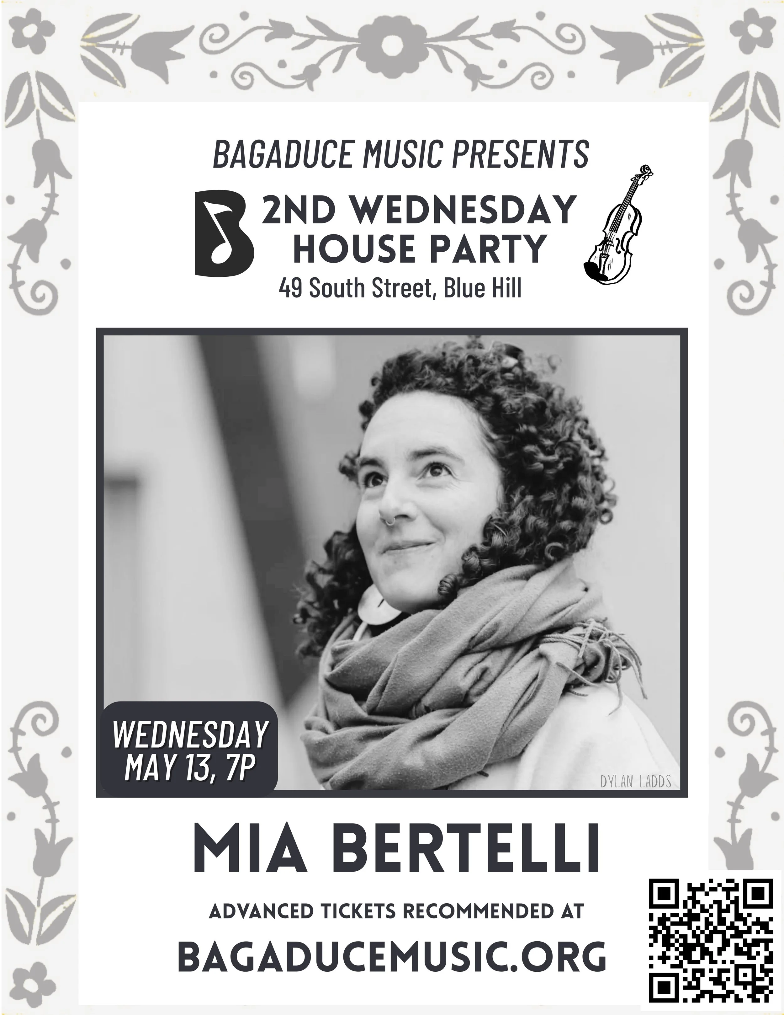 BLUE HILL—Bagaduce Music will host vocalist and performer Mia Bertelli for a concert at 7:00 pm on May 17. The event is part of the Second Wednesday House Party series.