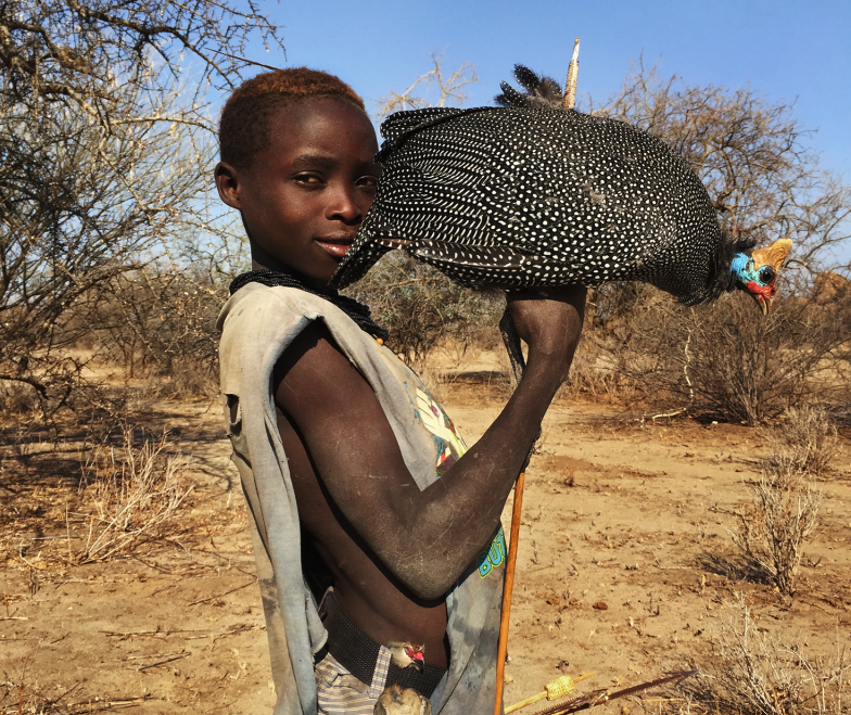 A young Hadzabe hunter with his catch of the morning- a Guinea fowl, near Lake Eyasi, Tanzania. Photo courtesy of Robin Bowman.