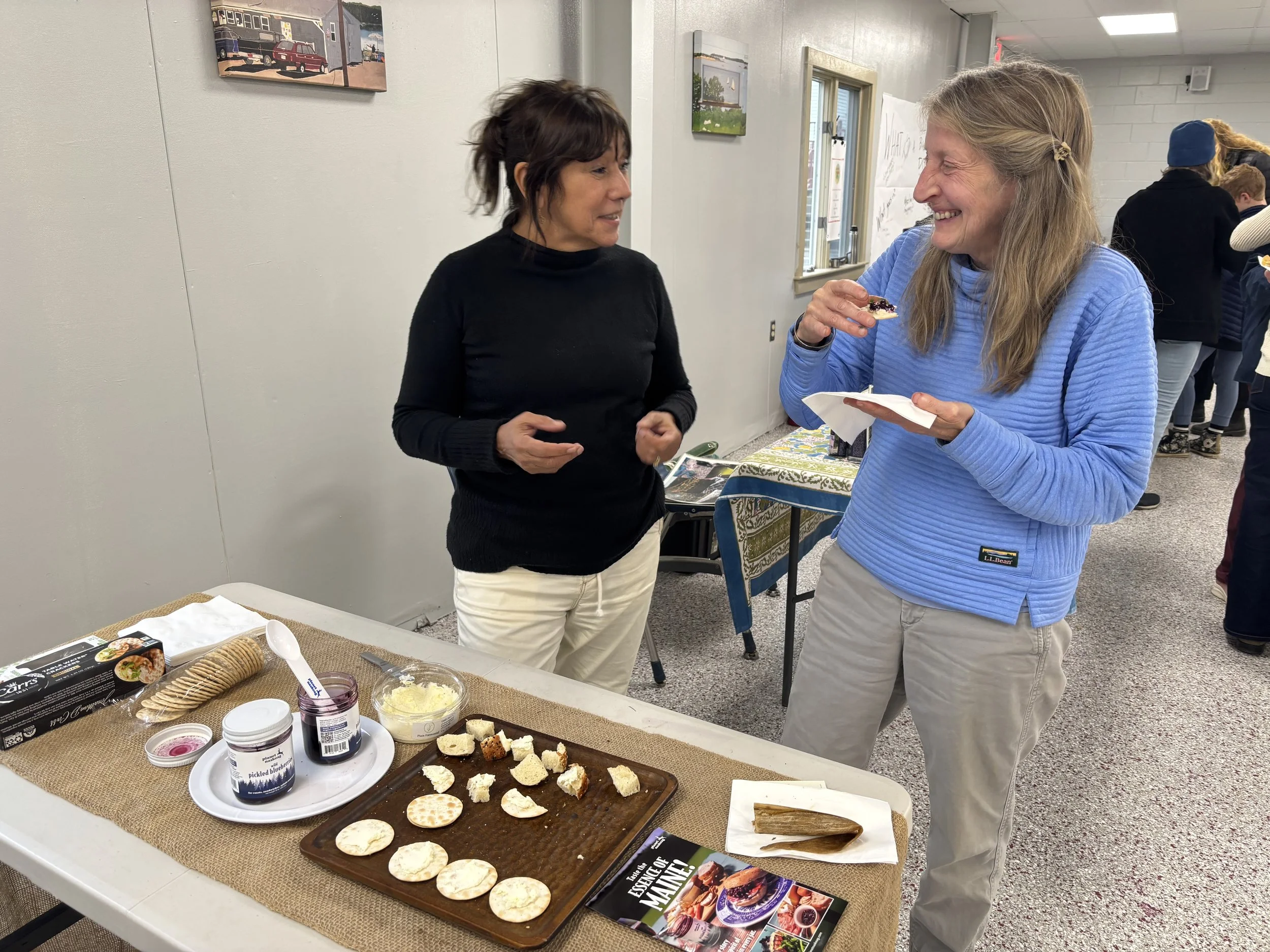Megan Macauley (right) of Somesville samples pickled blueberries made by Silvia Mathewson (left) of Planet Naskeag. Photo by John Boit.