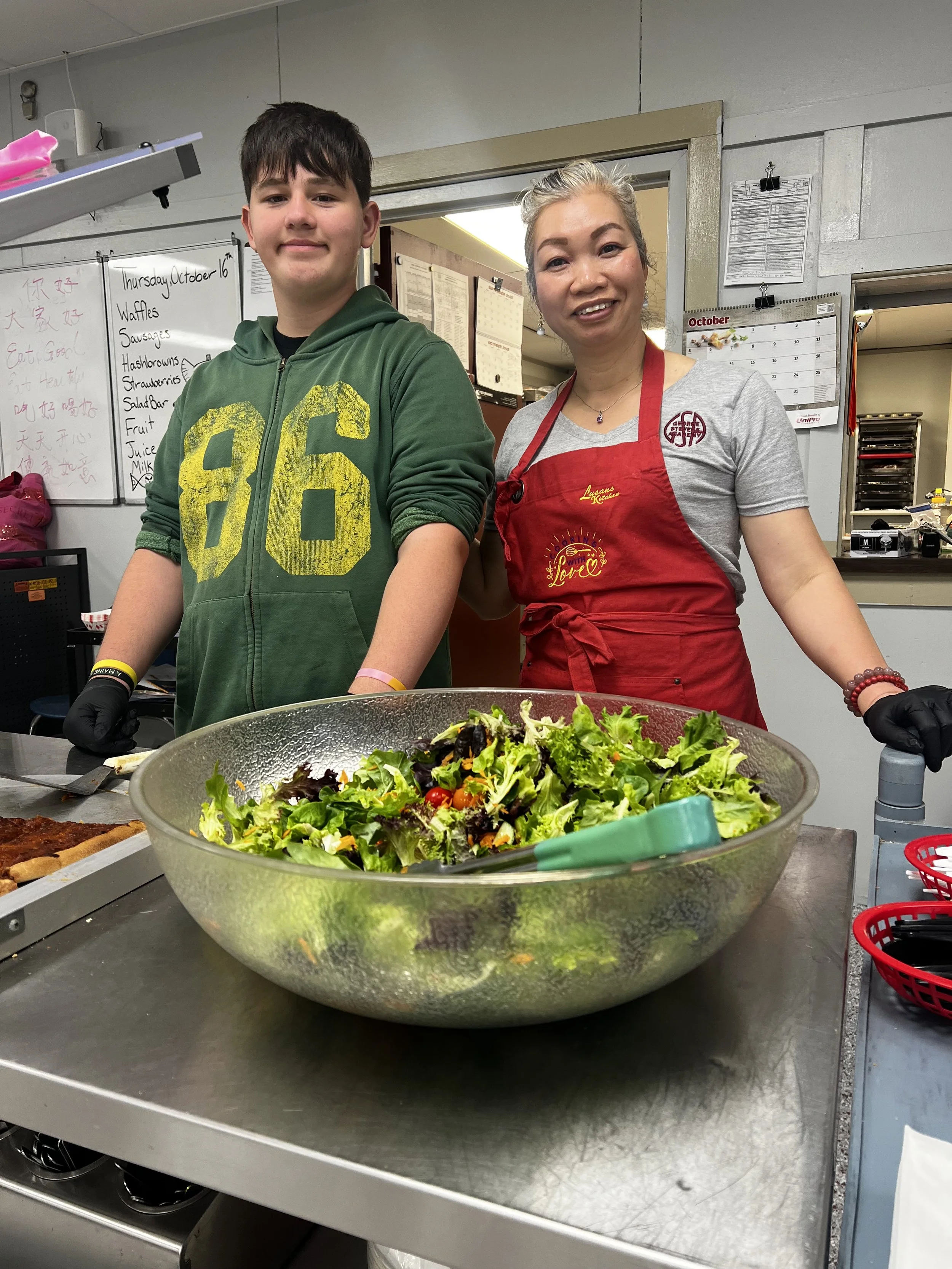 Chef Lu of George Stevens Academy (right) serves up a salad with with GSA sophomore Corwin Allen (left) for World Food Day. Photo by Eve Violette.