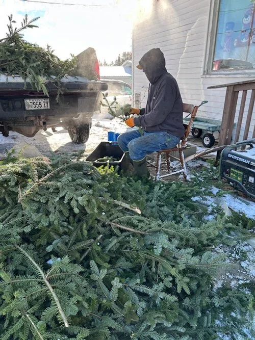 Wreath-making requires significant preparation and are time-consuming to make. Fir trees are harvested for the tips, which are cut about six to seven inches in length. Sustainable tipping allows the trees to be cut so that they come back even fuller next year.