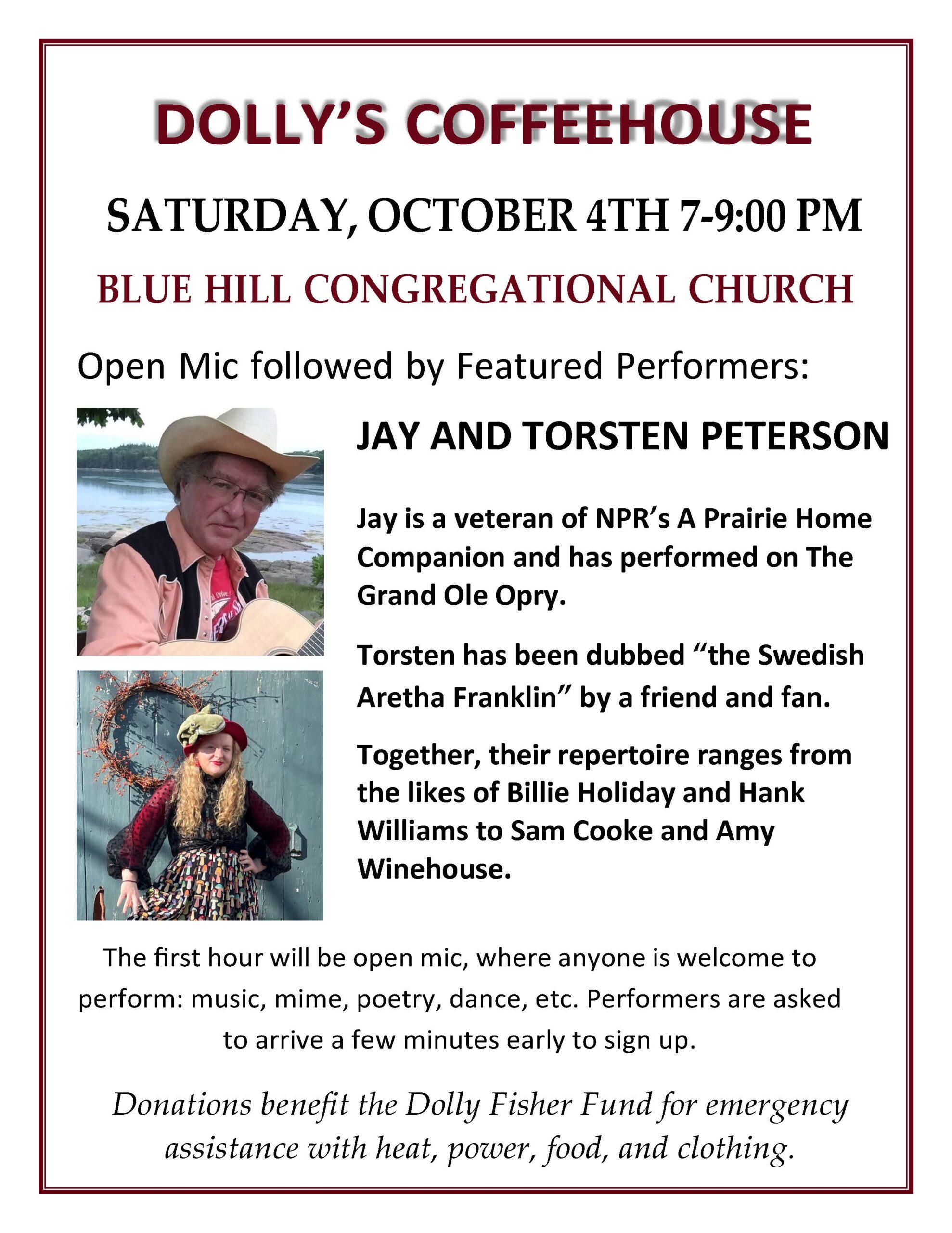Jay and Torsten Peterson will be the featured performers and hosts at Dolly’s Coffeehouse at the First Congregational Church of Blue Hill.