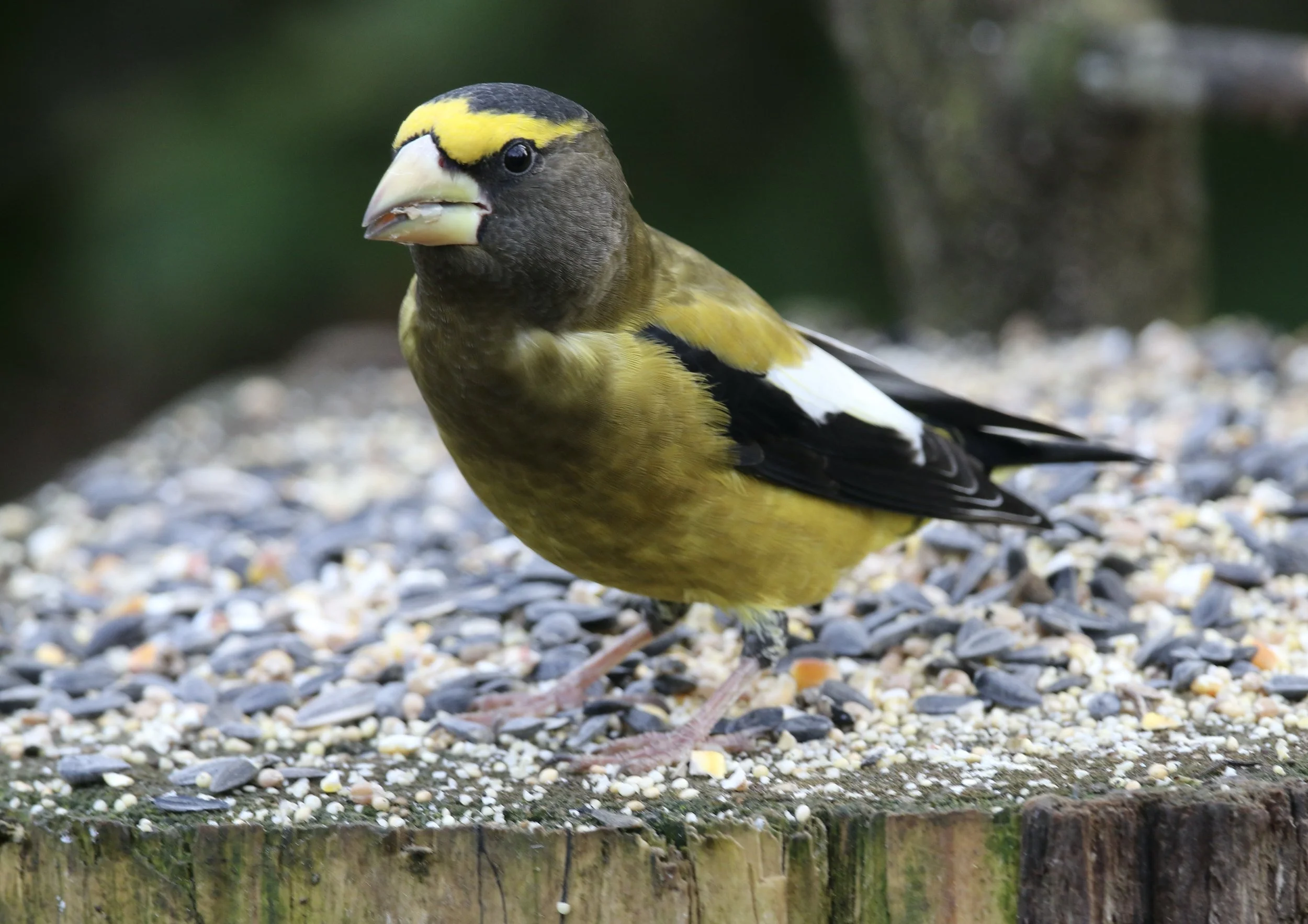 If you see a lot more Evening Grosbeaks this month, it’s because they aren’t finding the food sources they need in Canada. Photo courtesy of Leslie Clapp.