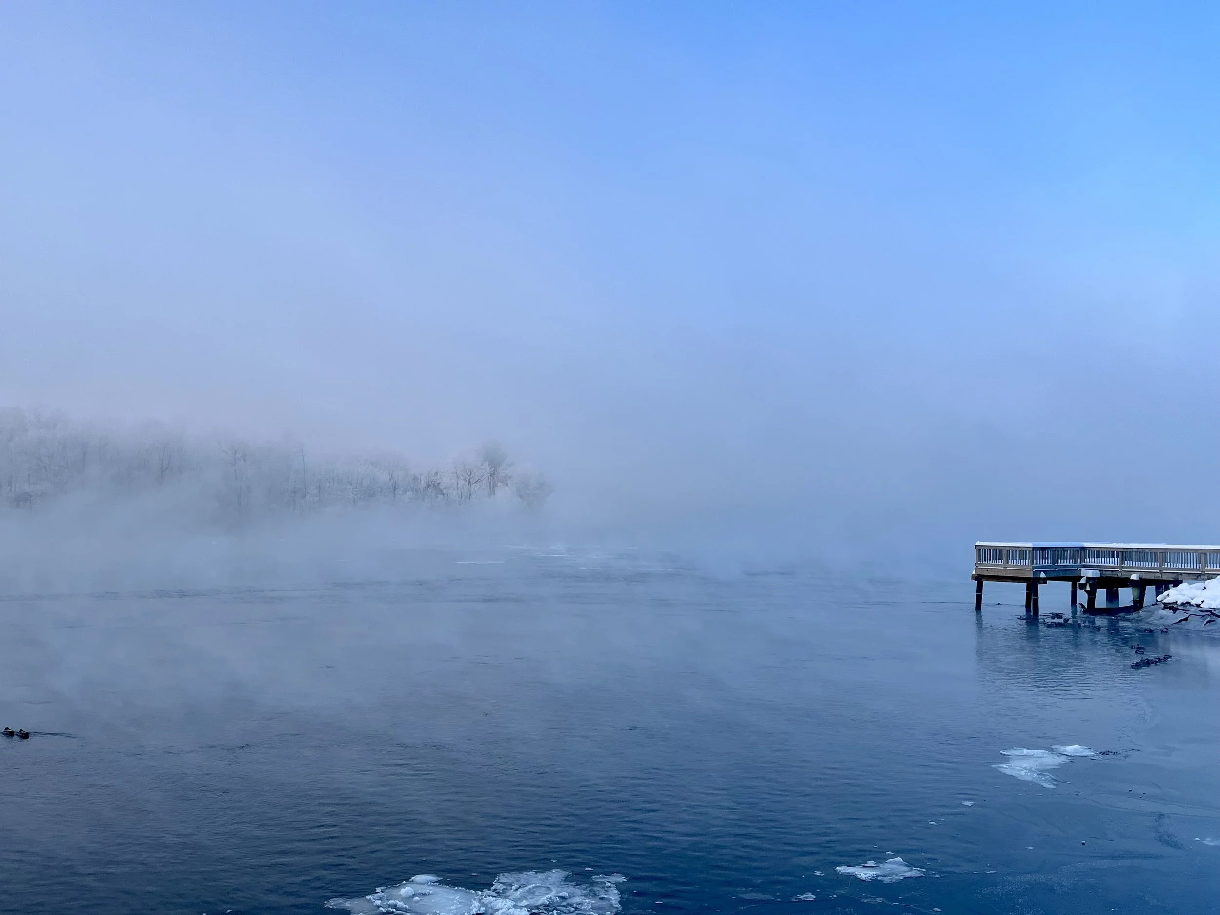 SMOKY RIVER—Sea smoke rises along the Penobscot River in Bucksport. Photo by Emily Baer.