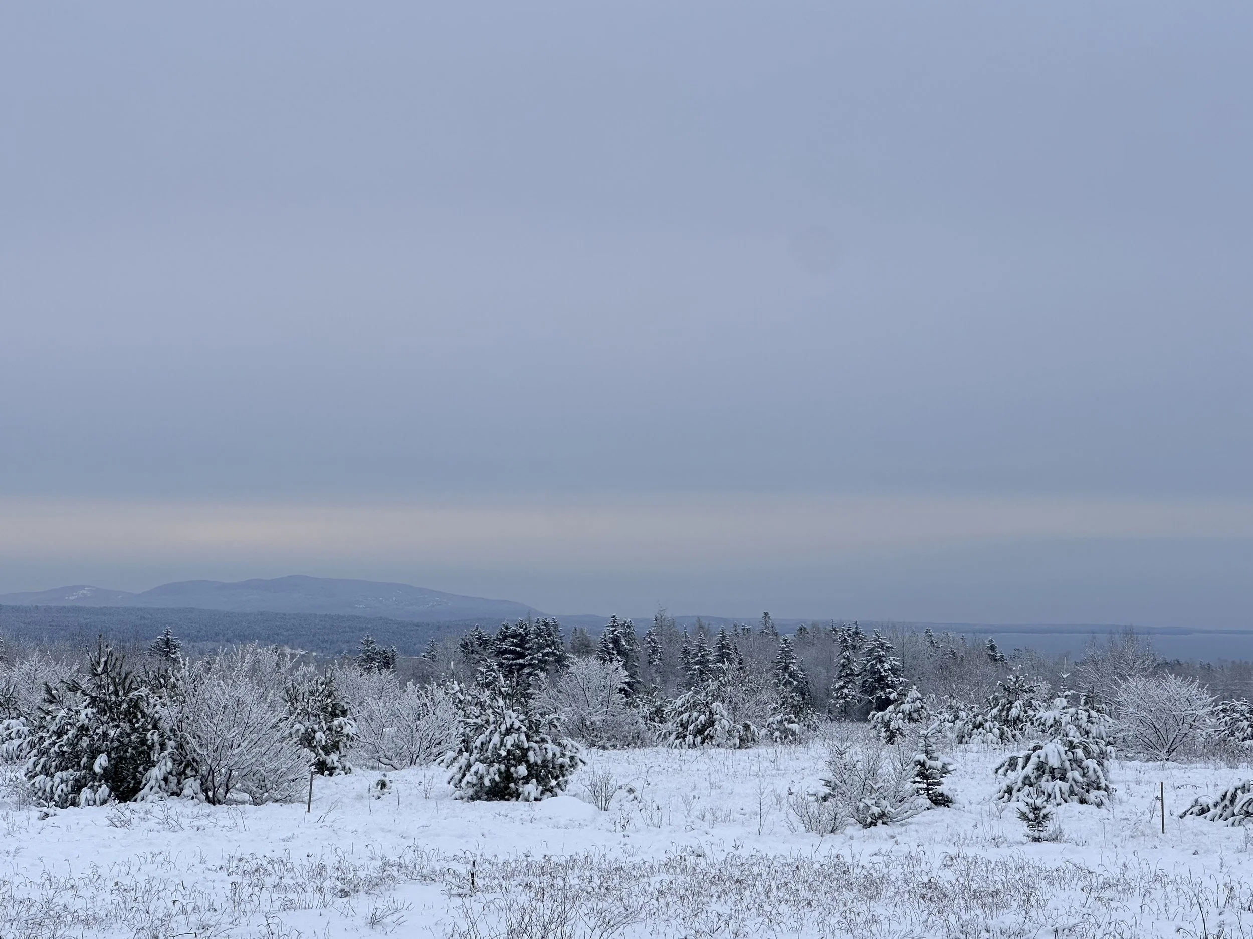 SLEEPING GIANT—Cadillac Mountain looms on a gray day as seen across a snowy field in Sedgwick. Photo by Jessica Hardy.