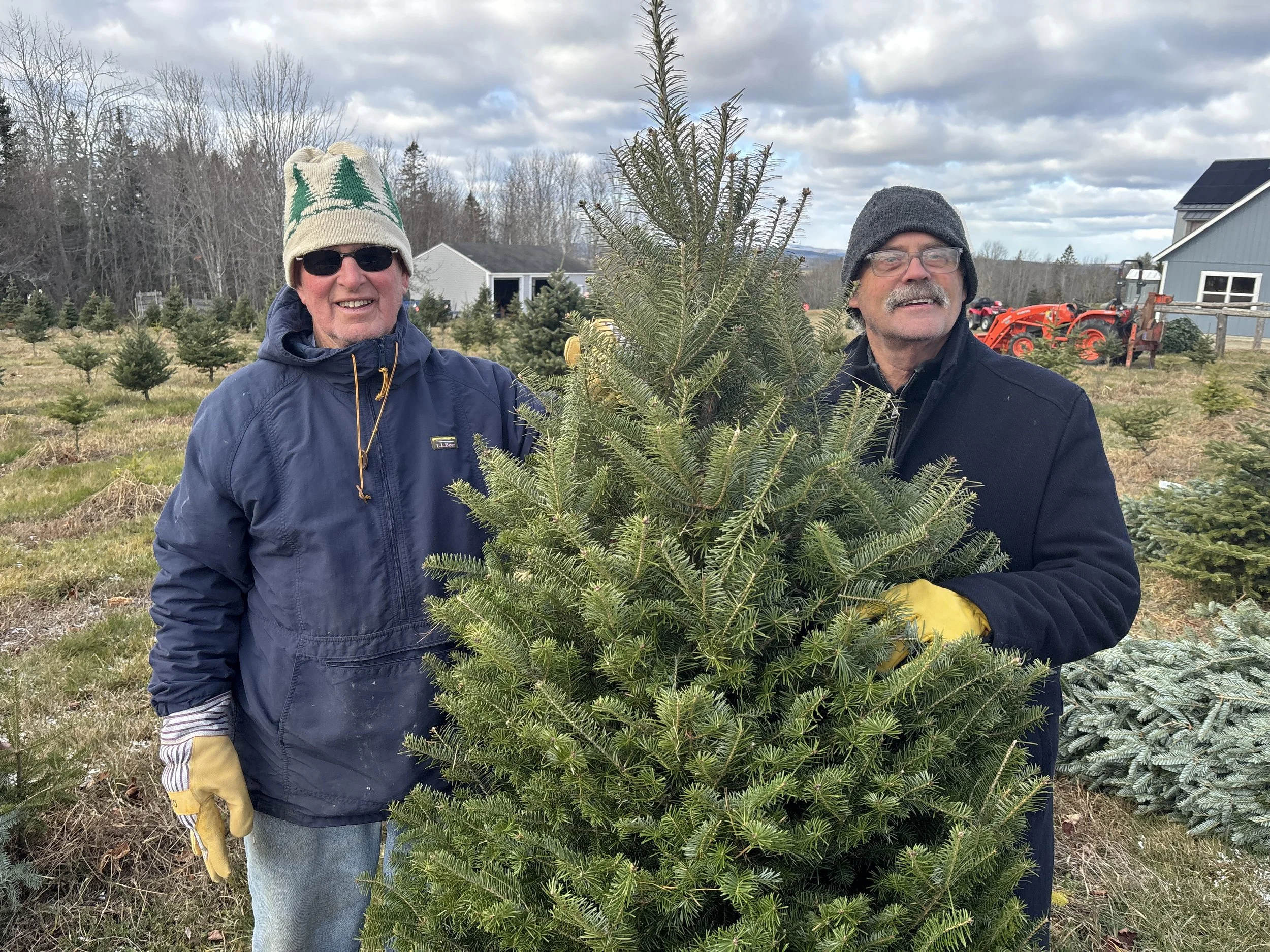 NICE PICK: Thanksgiving was barely in the rearview mirror when the rush was on to decorate for Christmas. John Clapp left, helps customer Matt Greany of Brooklin pic out a tree at Clapp’s Tree Farm in Blue Hill on Nov. 29. Photo by John Boit.