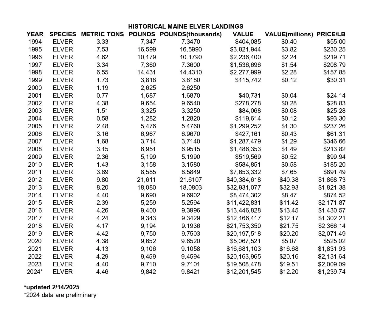 “Due to recent intense market demand, elvers have now become the most valuable marine resource in terms of price per pound which, in 2019, was over $2,000,” according to DMR’s website. Just 25 years ago, elvers were at a low of about $24 per pound.