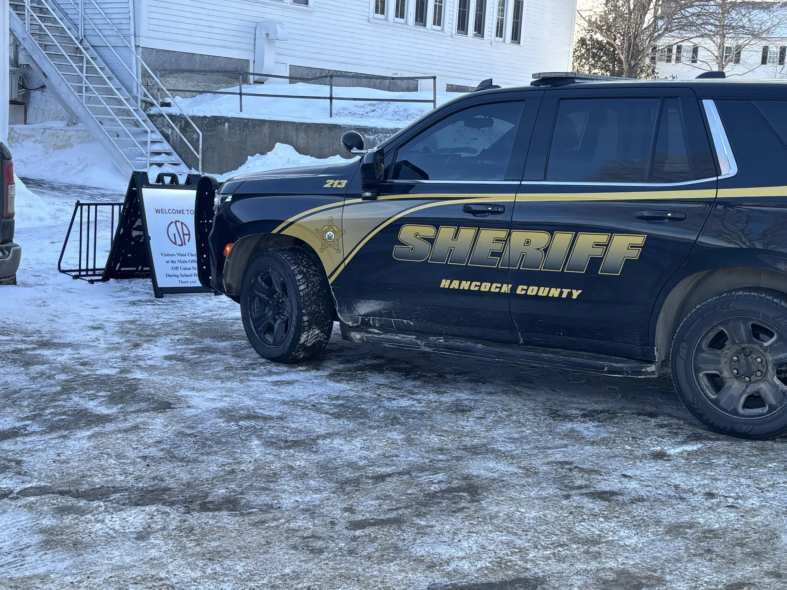 A vehicle from the Hancock County Sheriff’s Office outside George Stevens Academy on the morning of Feb. 2. Photo by John Boit.