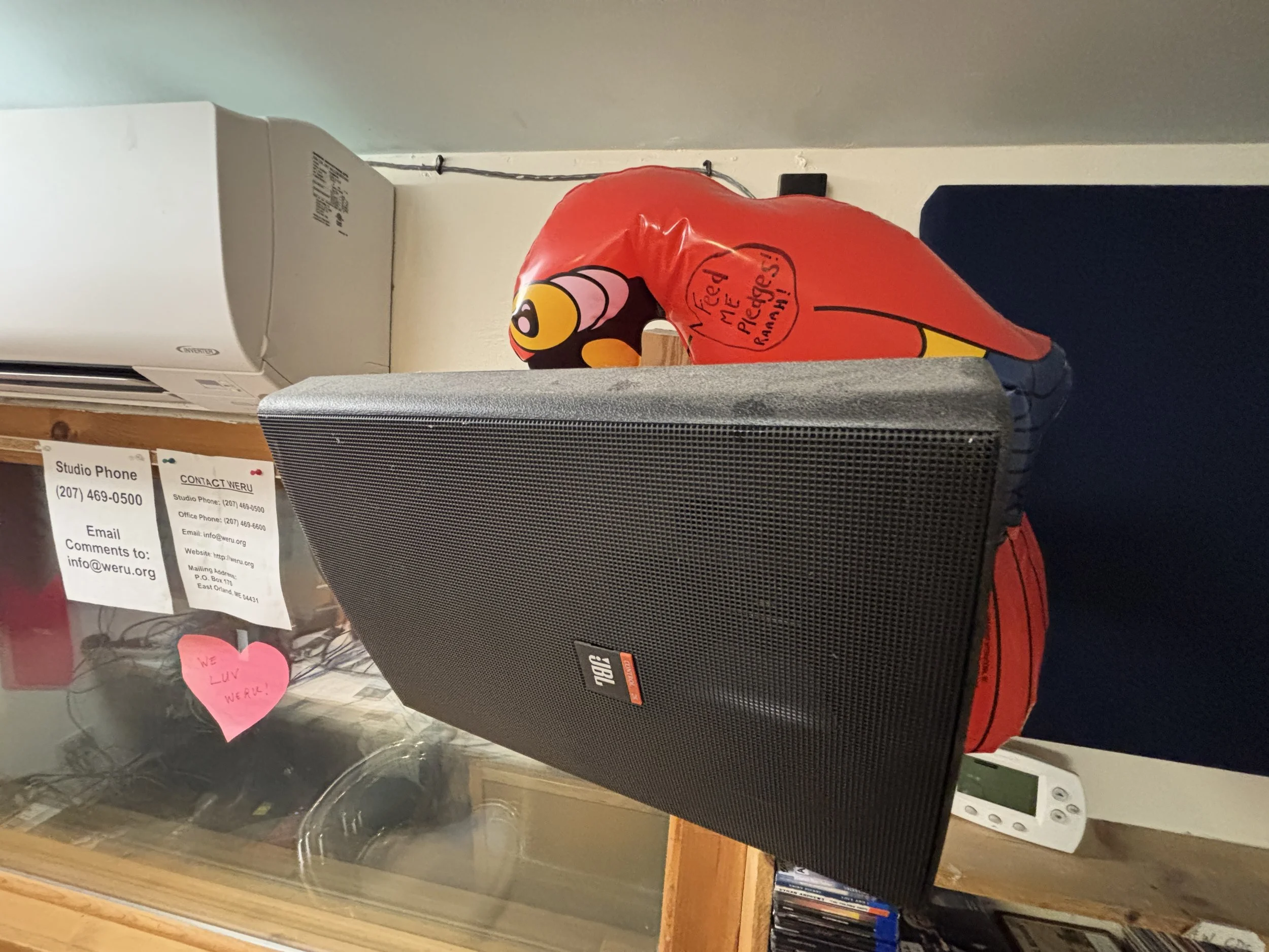 First thing I’d do is to size up if they were benevolent actors. If they seemed friendly enough–and they must be interesting, they’re aliens--I’d get them on the air. I'd invite them to come in and be guests on a show and to say, “Hi, I'm Gorp from Venus, and when I'm on Earth, I listen to WERU.” We do a lot of that, getting people who visit the station to record a little promo. What I would tell them is WERU is a noncommercial, nonprofit community radio station that’s listener-supported and volunteer-powered with diverse programming–over a hundred volunteers doing genres from music from Africa to techno from Germany to folk to jazz.
