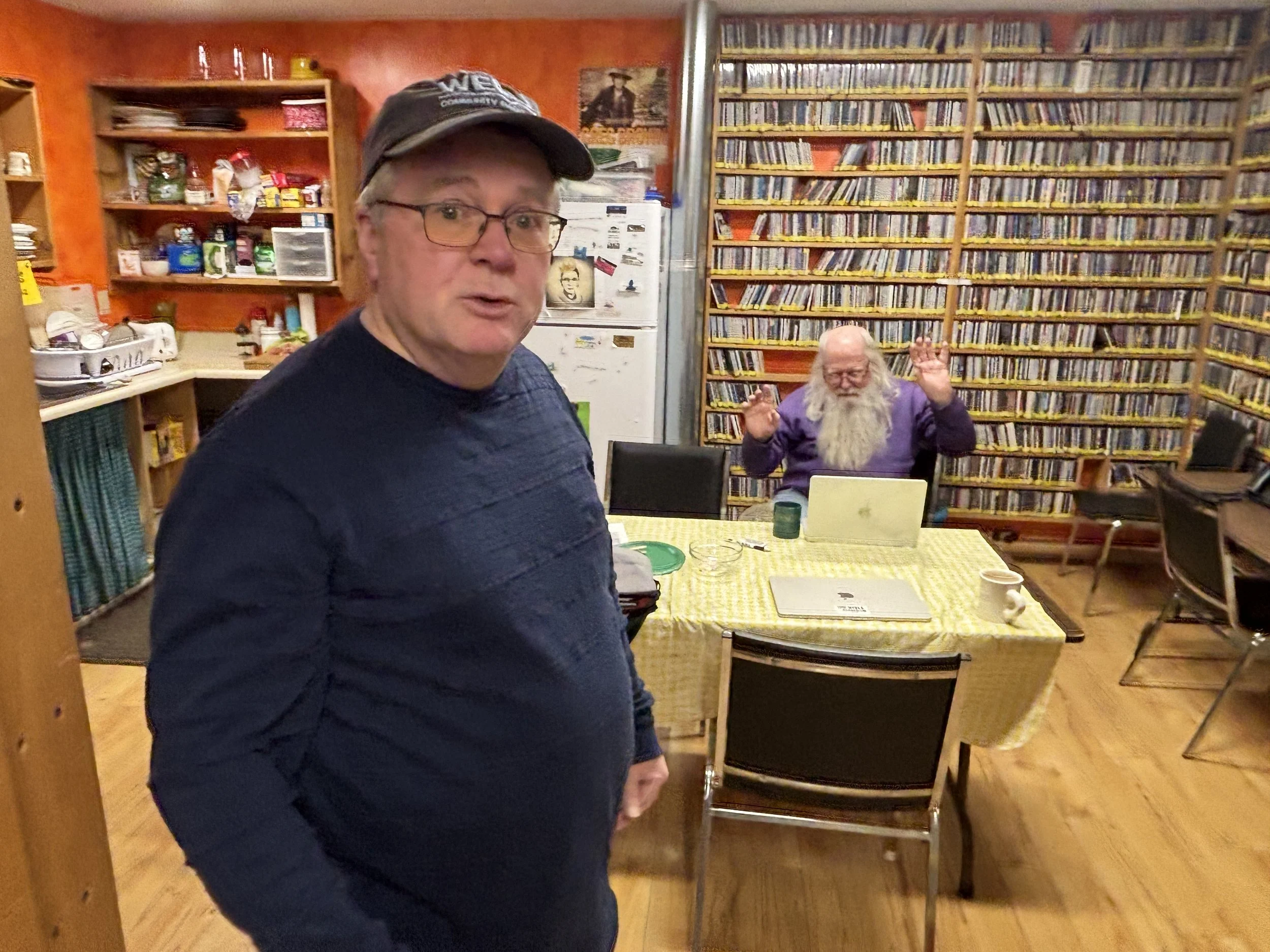 Murphy in the WERU kitchen, while station finance manager tends to a Zoom call. Photo by John Boit.