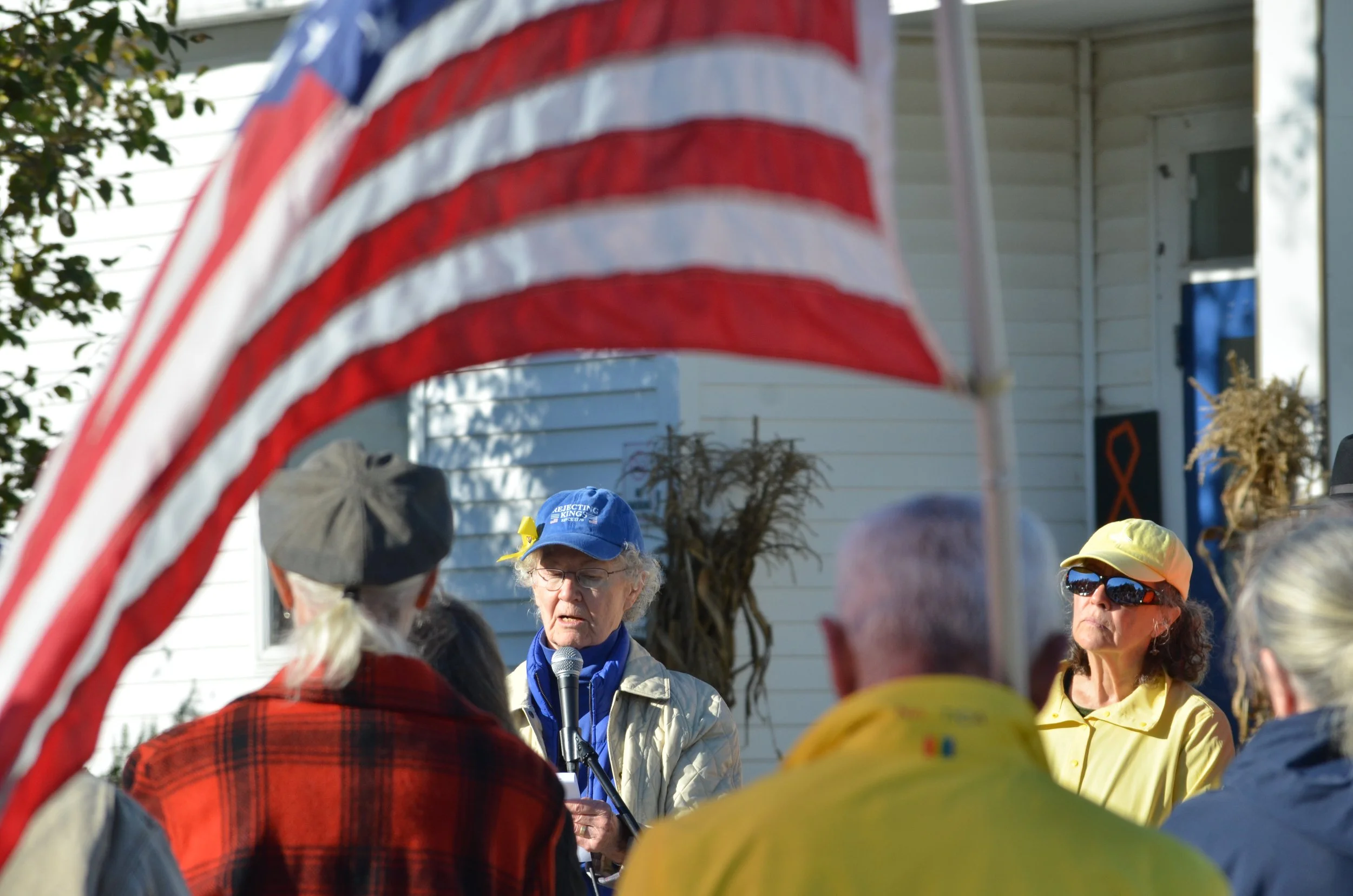 Abbie McMillen of Brooksville speaks at the Penobscot rally. Photo by John Boit.