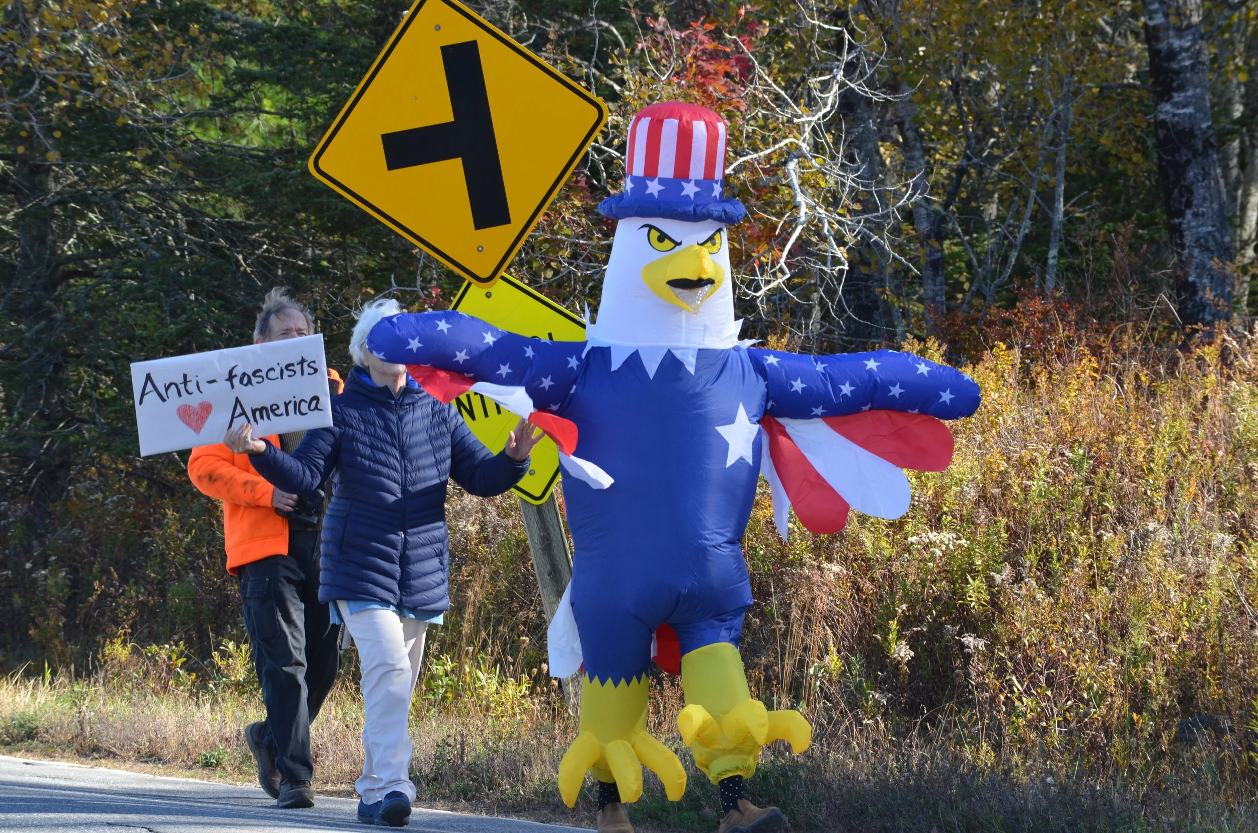 A man in an inflatable eagle suit walks in the Penobscot protest. Photo by John Boit.