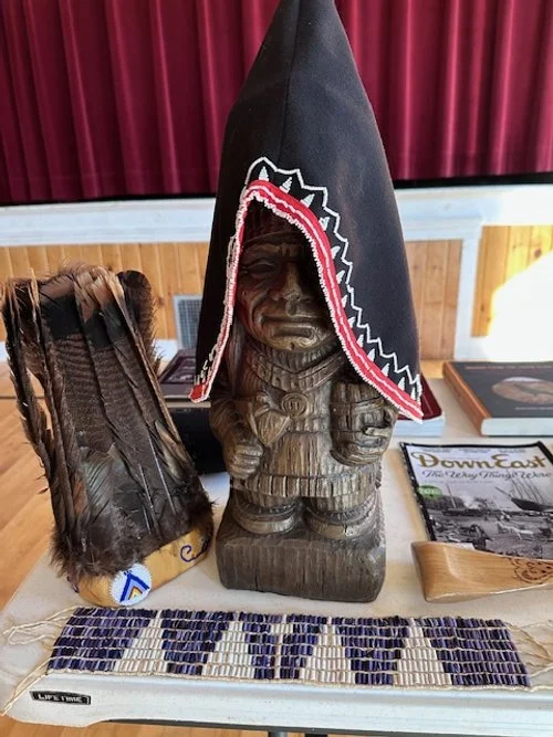 Tomah brought along several artifacts, including a model canoe, a Passamaquoddy statue with a woman's head piece, a quahog necklace and a feathered male head piece. Photos by Jessica Hardy.