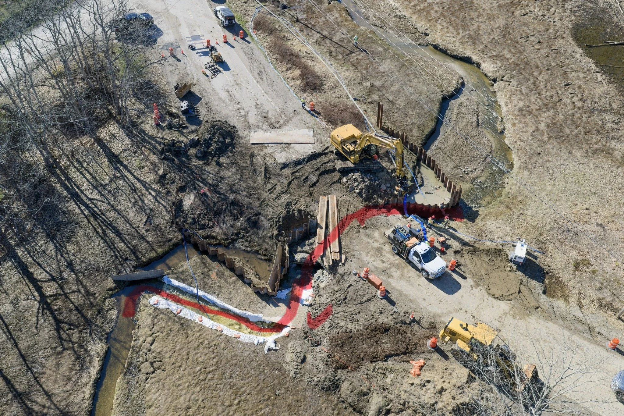 Town officials shared aerial photos of the work site on April 24 to help explain how the water flow has been redirected. “The permits for these projects, which came from the Department of Environmental Protection, do not allow for full-stream shut off,” Hatch said.