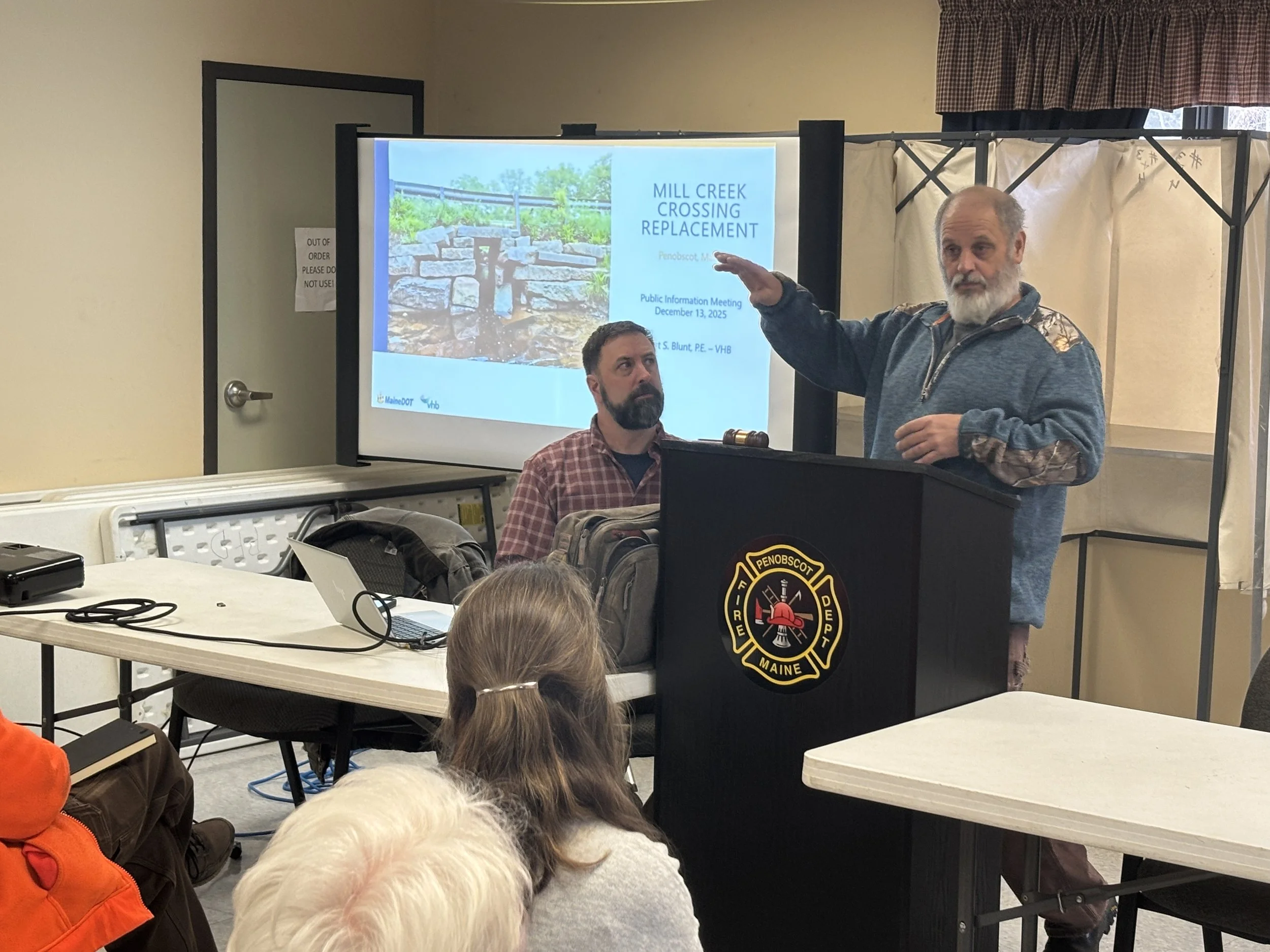 PENOBSCOT—Fifty residents of Penobscot turned out for a Dec. 13 public hearing to learn about plans and disruptions that will cut off one side of town from the other when a new culvert is built at Mill Creek this winter.