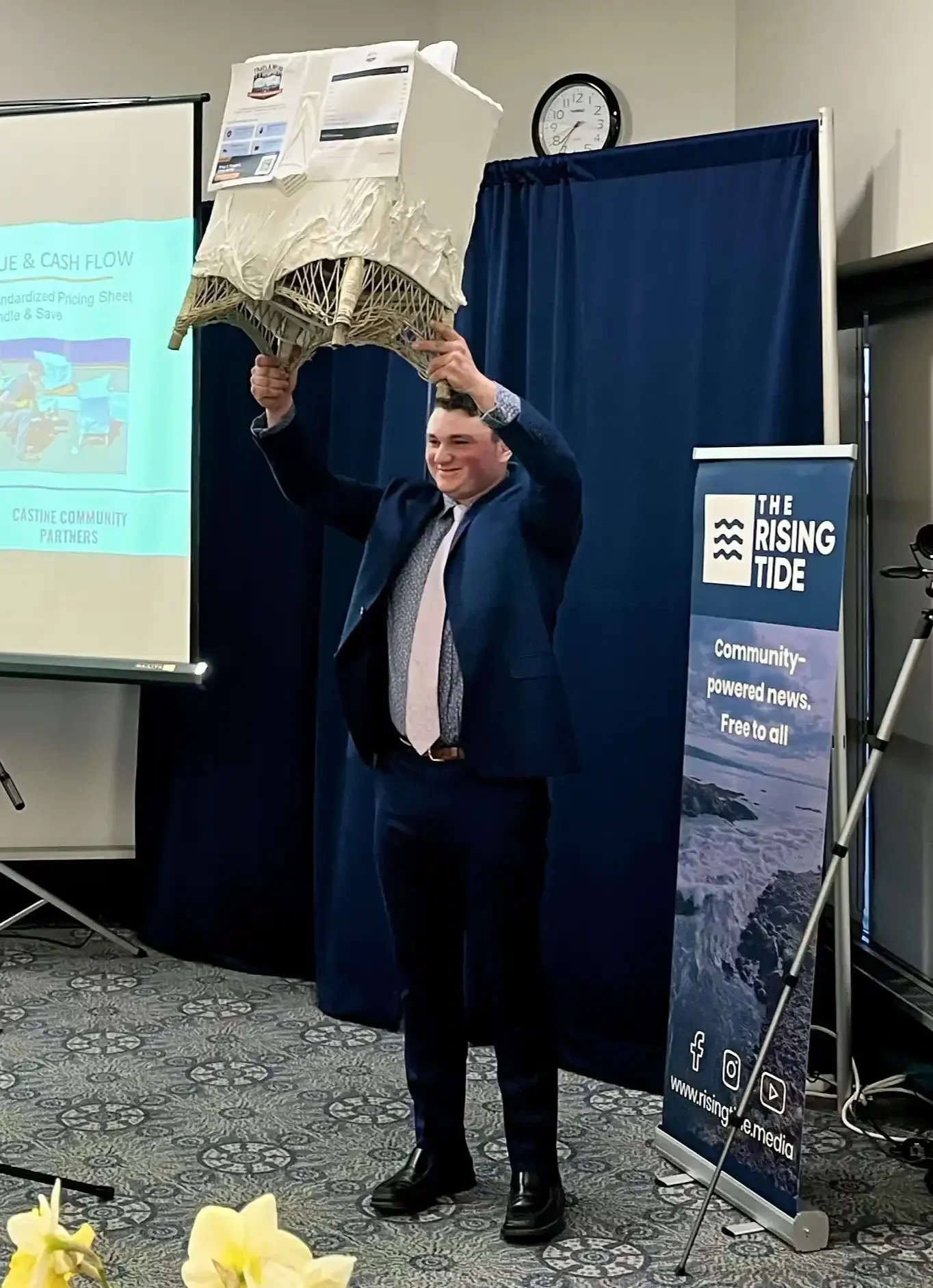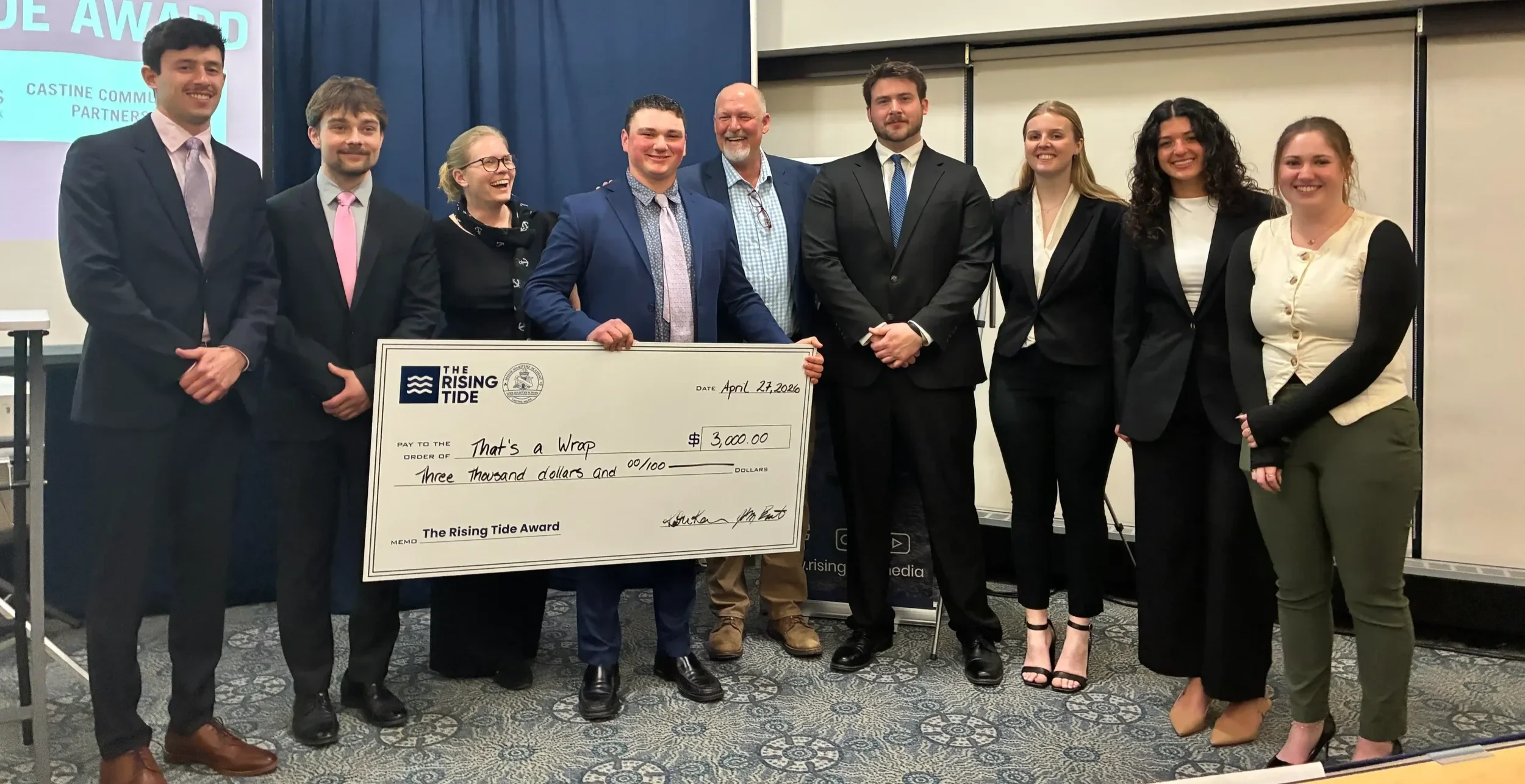 CASTINE–A start-up company that aims to shrink-wrap outdoor furniture won the inaugural Rising Tide Award at Maine Maritime Academy on April 27 in a competition among student teams who pitched their ideas in front of a live audience.